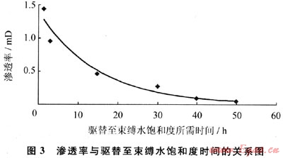以氣驅水1h為例,驅替1h后,儲層滲透率越低,含水飽和度就越高,由此造成的暫時性水鎖損害越強(圖2),當滲透率從1.5mD降到0.04mD時,儲層滲透率損害率從17%增加到近90%。隨著驅替時間的增長,含水飽和度會逐漸降低,當驅替至束縛水飽和度時,暫時性水鎖完全解除。在驅替壓差及流體性質一定的情況下,解除暫時性水鎖所需時間與儲層滲透率密切相關,儲層滲透率越低,所用時間越長(圖3);當滲透率從1.5mD降到0.04mD時,驅替至束縛水飽和度時所用時間從1.5增加到50h,表明儲層滲透率越低,暫時性水鎖越難解除。地層條件下所能提供的最大壓降要比實驗室所用的壓差小得多,且實驗室用的是干氮氣,因此在地層條件下天然氣反排外來工作液至束縛水飽和度所需時間比實驗室長得多,其時間長短與儲層滲透率有關。