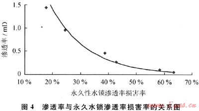 天然氣反排外來工作液降到束縛水飽和度后就再也不能降低了,由于儲層原始含水飽和度低于束縛水飽和度,這樣就有一部分水鎖永遠不能解除。永久性水鎖滲透率損害率與儲層滲透率密切相關,儲層滲透率越低,束縛水飽和度與原始含水飽和度差值越大(表1、圖1),永久性水鎖滲透率損害率也越強(圖4)。當滲透率從1.5mD降到0.04mD時,永久性水鎖滲透率損害率從17.75%增至63.33%。