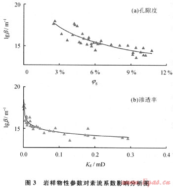 高速非達(dá)西滲流特征是多孔介質(zhì)中氣體滲流普遍存在的特殊滲流現(xiàn)象。不同的物性參數(shù)條件下高速非達(dá)西滲流效應(yīng)對(duì)氣體滲流的影響程度不同,紊流系數(shù)(β)的大小直觀反映了高速非達(dá)西對(duì)氣體滲流的影響程度。物性參數(shù)與紊流系數(shù)關(guān)系實(shí)驗(yàn)結(jié)果見(jiàn)圖3???/span>體而言,隨著氣相有效孔隙度及氣相有效滲透率增加,紊流系數(shù)逐漸減小,表明儲(chǔ)層物性越差高速非達(dá)西滲流效應(yīng)越明顯。