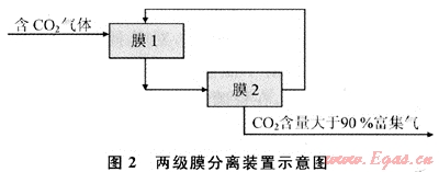 膜分離法是利用某些聚合材料制成的薄膜對不同氣體具有不同滲透率來選擇分離氣體的。膜分離的驅動力是膜兩側的壓差,在壓差條件下,滲透率高的氣體組分優(yōu)先透過薄膜,形成滲透氣流,滲透率低的氣體則在薄膜進氣側形成殘留氣流,兩股氣流分別引出從而達到分離的目的[21]。適用于CO2分離的膜材料為乙酸纖維、聚砜、聚酰胺等,由于膜本身或膜組件的其他材料耐熱性能差,150℃是其操作溫度的上限。近年來一些性能優(yōu)異的新型膜材質正不斷涌現,如聚酰亞胺膜、聚苯氧改性膜、二胺基聚砜復合膜、含二胺的聚碳酸酯復合膜、丙烯酸酯的低分子含浸膜等均表現出優(yōu)異的C02滲透性。最近也有一些硅石、沸石和碳素無機膜的研制,但均存在使用溫度高、成本高,長期運行可靠性差等問題。圖2為兩級膜分離富集CO2流程圖。