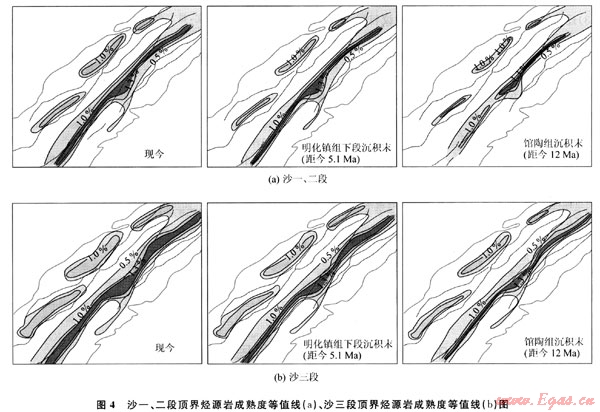 摘要:為研究渤海東北部海域遼東灣地區(qū)烴源巖的演化史,運用盆地模擬技術(shù),在恢復該區(qū)熱演化史和埋藏史的基礎(chǔ)上,利用EASY%Ro計算模型對10條測線進行烴源巖成熟度演化分析,勾畫出烴源巖演化平面圖,得出遼中凹陷和遼西凹陷烴源巖的演化特征。研究結(jié)果表明:①遼中凹陷中北洼熱演化程度明顯高于南洼;②遼西凹陷北洼、南洼、中洼熱演化程度基本相同;③遼中凹陷比遼西凹陷熱演化程度高;④現(xiàn)今,遼中凹陷深部古近系沙河街組三段和沙一、二段烴源巖處于高成熟階段,凹陷邊緣處于重要生油區(qū),遼西凹陷主力烴源巖處于生油氣高峰。