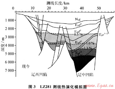 遼東灣地區(qū)有多個次級構(gòu)造帶,各凹陷烴源巖的演化程度有較大差異。為了進一步揭示和刻畫其演化差異,在單井模擬的基礎(chǔ)之上,結(jié)合以往研究成果,從該區(qū)選擇了10條二維剖面(圖1),應用EASY%Ro模型進行埋藏史、熱史和成熟度演化史模擬。以測線LZ281剖面成熟度演化史模擬為例(圖3),模擬結(jié)果表明:整體來看,對于同一層位來說,與遼中凹陷相比,遼西凹陷的熱演化程度較低。遼東灣的生烴門限約為深度2500m(Ro>0.5%),遼中凹陷東二下段和遼西凹陷的東三段烴源巖進入生烴門限。遼東灣地區(qū)的排烴高峰(0.8%<Ro<1.0%)為深度3400~3600m,遼中凹陷東三段下部及沙一、二段烴源巖和遼西凹陷沙三段烴源巖處于排烴高峰階段,產(chǎn)生大量液態(tài)烴。深度超過4400m處,遼中凹陷大部分沙三段烴源巖進入高成熟階段(Ro>1.3%),以生成凝析氣、濕氣為主;沙四段烴源巖Ro>2.0%,進入過成熟階段。可見,現(xiàn)今遼西凹陷東三段-沙三段主力烴源巖主要處于生、排烴高峰,生成大量油氣,是目前遼西凹陷及其周圍地區(qū)內(nèi)一系列大中型油氣田發(fā)現(xiàn)的物質(zhì)基礎(chǔ);而遼中凹陷熱演化程度較高,除東下段和沙一二段烴源巖還處于生油階段,沙三段烴源巖主要處于生氣階段,是遼中凹陷和遼西低凸起發(fā)現(xiàn)大規(guī)模凝析氣田和油田的物質(zhì)基礎(chǔ)。