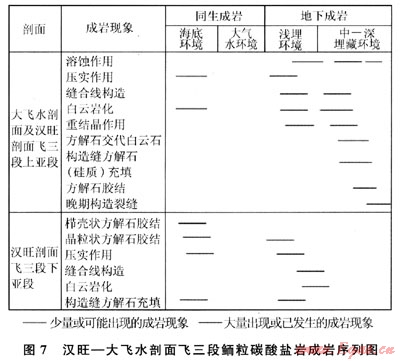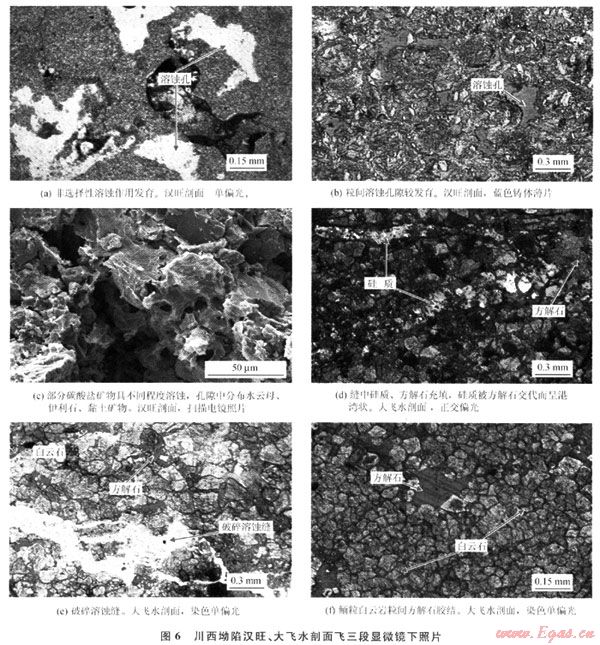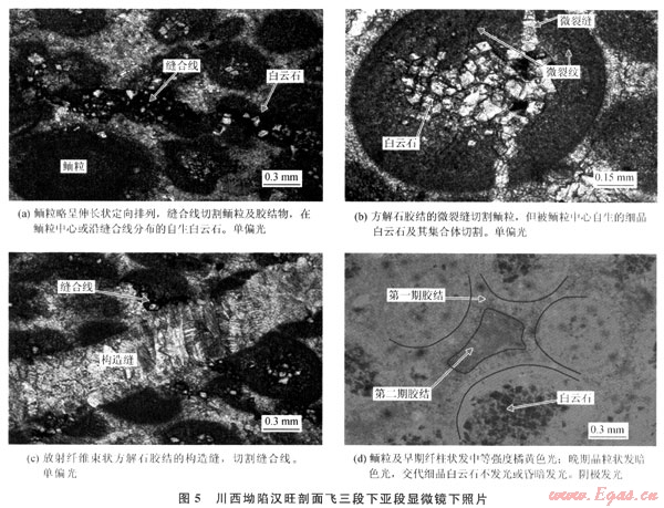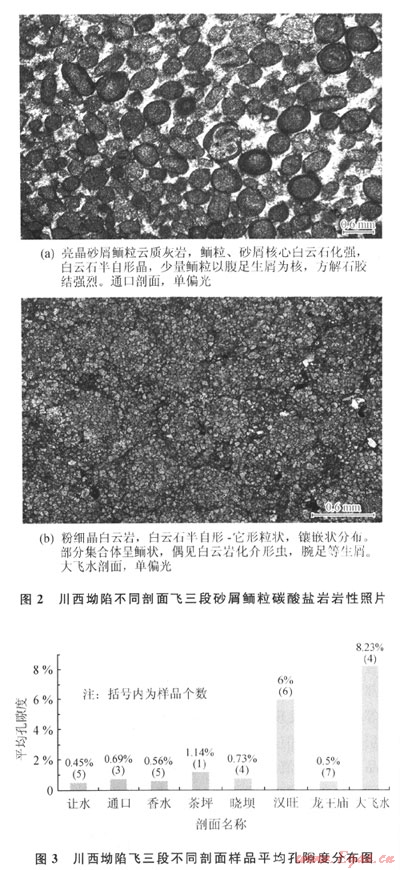 從成巖序列來看,川西坳陷北段南部與南段的成巖作用有明顯的差異,北段南部以海底成巖、淺埋成巖作用為主,而南段大飛水剖面以埋藏成巖作用為主,中、深埋藏成巖作用顯著。總體上,飛三段成巖作用在平面上由北向南,成巖作用由海底向埋藏成巖變化。北段南部(如漢旺剖面下亞段)經(jīng)歷了明顯的海底成巖作用,纖維狀等厚環(huán)邊、粒狀方解石膠結(jié)普遍發(fā)育,這使原始粒間孔隙顯著減小。在埋藏成巖環(huán)境中,壓實、壓溶和膠結(jié)作用使孔隙度進一步降低,而鮞粒內(nèi)及沿縫合線分布的白云巖化作用,對孔隙度影響較小,使最終孔隙度很低。漢旺剖面上亞段和南段(大飛水剖面)的成巖作用相似,埋藏期的壓實作用較強烈,白云巖化可能均為埋藏成因,重結(jié)晶現(xiàn)象較強烈且未發(fā)現(xiàn)同生成巖期大氣水溶蝕作用形成的鮞粒鑄??祝砻骺赡芘c埋藏溶蝕作用有關(guān),中-晚期溶蝕作用是孔隙發(fā)育的重要因素。