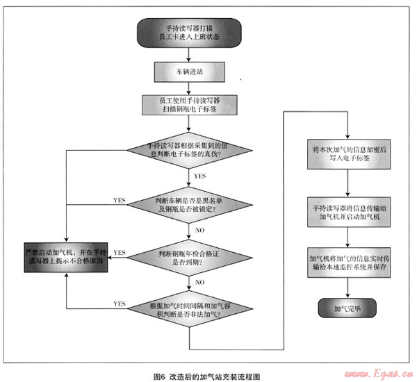 CNG加氣站進行信息化配套改造建設(shè),實現(xiàn)充裝記錄的實時上傳和斷點續(xù)傳功能,滿足在線和離線加氣的需要,并實現(xiàn)手持瀆寫器程序的在線更新,滿足對加氣控制變更的需要;進行加氣機改造,加氣人員用手持讀寫器對標(biāo)簽信息進行讀寫、并對加氣槍進行控制,對符合條件的氣瓶打開加氣槍充裝,不合格氣瓶加氣槍不能打開,并顯示不合格原因,從而實現(xiàn)對氣瓶安全充裝的動態(tài)管理。