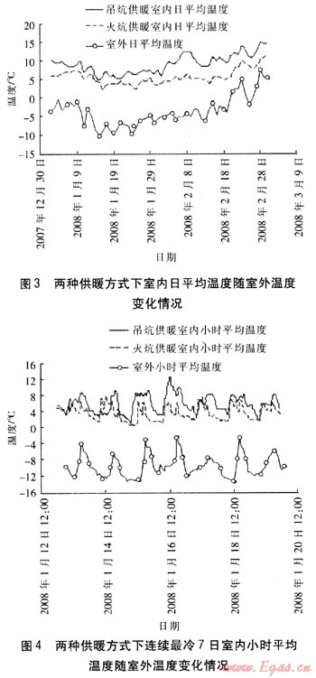 在建筑結(jié)構(gòu)、熱工性能、供暖面積、生活習(xí)慣相近的條件下,對(duì)分別采用散熱器、地板輻射供暖、散熱器+吊炕、散熱器+火炕供暖方式的室內(nèi)小時(shí)平均溫度進(jìn)行實(shí)測(cè)。在連續(xù)最冷7日內(nèi),采用散熱器供暖、地板輻射供暖的農(nóng)村居民室內(nèi)小時(shí)平均溫度較高,受室外溫度的影響較小,且地板輻射供暖熱穩(wěn)定性最好。采用散熱器+吊炕供暖的室內(nèi)溫度比采用散熱器+火炕供暖的室內(nèi)小時(shí)平均溫度高,但采用這兩種供暖方式的室內(nèi)小時(shí)平均溫度波動(dòng)性較大。