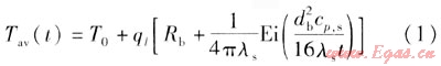 地埋管換熱器的傳熱模型主要有線熱源模型、柱熱源模型。線熱源模型是基于1948年Ingersoll和Plass等人發(fā)展的Kelvin線熱源理論[8]。工程上常見(jiàn)的地埋管換熱器的直徑一般為26~36mm,鉆孔深度為40~200m,與鉆孔深度相比,地埋管的直徑很小。在地埋管換熱器工作時(shí),相當(dāng)于在半無(wú)限大介質(zhì)中,鉆孔中心的一根線熱源與周?chē)鷰r土進(jìn)行熱交換。另外,假設(shè)沿地埋管長(zhǎng)度方向傳熱量忽略不計(jì),周?chē)鷰r土均勻且線熱源與巖土的傳熱量恒定。由于該方法不受具體換熱器形式的限制,計(jì)算較簡(jiǎn)單,且能滿(mǎn)足一般工程中土壤源熱泵系統(tǒng)設(shè)計(jì)計(jì)算的要求,具有較廣泛的實(shí)用性。根據(jù)假設(shè),可以得到地埋管內(nèi)流體平均溫度與鉆孔周?chē)鷰r土初始平均溫度及其他參數(shù)之間的關(guān)系式[9]: