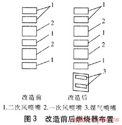 鍋爐原煤粉燃燒器為四角切圓布置,考慮到煤氣燃燒與煤粉燃燒的兼容性和爐內(nèi)空氣動力場的穩(wěn)定性,煤氣燃燒器仍以切圓布置方式為宜。經(jīng)計(jì)算,若煤氣燃燒器采用布置在原煤粉燃燒器下的四角切圓燃燒,則要求原煤粉燃燒器下層噴嘴至運(yùn)行層的間距應(yīng)不小于1000mm,而實(shí)際間距僅有700mm,四角切圓方案難以實(shí)現(xiàn)。因此,煤氣燃燒系統(tǒng)最終采用六角切圓布置方式,其中4只煤氣噴嘴直接布置在煤粉噴嘴下部,另外2只煤氣噴嘴布置在左右側(cè)墻的中心,主煤氣輸送管道進(jìn)入鍋爐房后分為兩根煤氣分管道布置于鍋爐兩側(cè),每根分管道再各分出3根支管連接煤氣燃燒器,見圖2。為擴(kuò)大切圓直徑,增加受熱面的吸熱量,降低火焰中心位置,煤氣燃燒器出口軸線分別在原煤粉燃燒器噴嘴出口軸線方向上水平向外偏轉(zhuǎn)20°,向下偏轉(zhuǎn)20°。改造前后燃燒器布置見圖3。綜合考慮低熱值煤氣著火與燃燒的穩(wěn)定性及火焰的長度,煤氣燃燒器采用雙通道煤氣噴嘴,具有部分預(yù)混作用,噴嘴出口煤氣流速約32m/s,空氣流速約35m/s[4~7]。