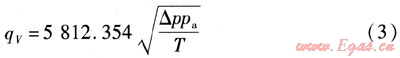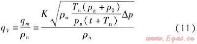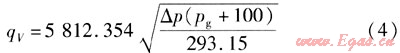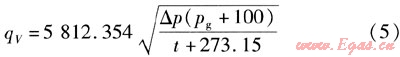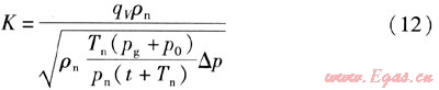 將數(shù)據(jù)qV=3000m3/h,ρn=1.293kg/m3,L=273.15K,pg=5kPa,p0=100kPa,pn=101.32kPa,t=20,△p=0.74377kPa代入式(12),可求得:K=4025.3021。