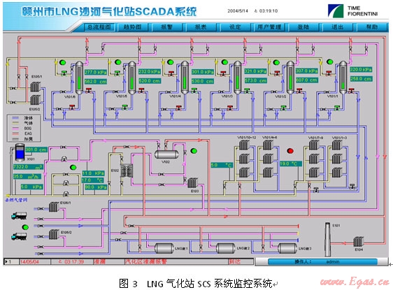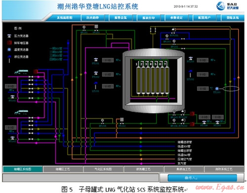SAE-LSMS系統(tǒng)已成功在國內(nèi)應(yīng)用多年,2005年深圳美視電廠總管式增壓40kfg,氣化量48,000NM3/H,2007年深圳燃氣集團梅林LNG應(yīng)急調(diào)峰站單元式增壓20kfg,氣化量小時40,000NM3/H,2008年南京港華兩個2500立方LNG子母罐氣化站均已應(yīng)用該系統(tǒng)。均取得了較好的效果。圖5為廣東潮州子母罐式LNG氣化站SCS系統(tǒng)監(jiān)控畫面。