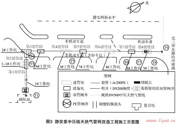 下面,以靜安里中壓線天然氣管網(wǎng)改造工程為實(shí)例,具體介紹一下裂管施工技術(shù)在燃?xì)夤芫€改造丁程中的應(yīng)用。