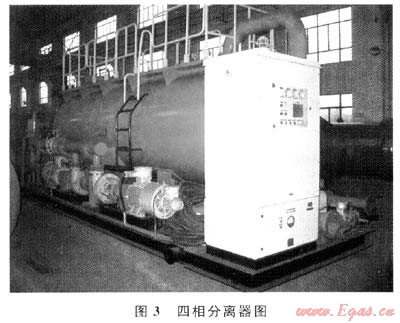 四相分離器在密閉系統(tǒng)中發(fā)揮重要作用,是其核心裝備。密閉系統(tǒng)中的儲(chǔ)油罐、沉砂罐、鉆井液緩沖罐等后續(xù)設(shè)備都是為該裝備服務(wù),該裝備的分離效率穩(wěn)定與否直接關(guān)系到整個(gè)密閉系統(tǒng)能否正常運(yùn)行。美國(guó)、加拿大、英國(guó)等國(guó)家的一些石油公司相繼研制出了鉆井液四相分離裝置,并進(jìn)行了多次現(xiàn)場(chǎng)使用。目前川慶鉆探工程公司鉆采工藝技術(shù)研究院對(duì)四相分離器進(jìn)行了研制(圖3),并取得了重要進(jìn)展[3~7]。