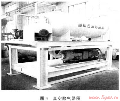 在鉆井作業(yè)過(guò)程中,地層中的氣體往往會(huì)侵入到鉆井液中,形成大量的大小不等的氣泡。在密閉系統(tǒng)中,四相分離器只能清除體積較大的氣泡,對(duì)于溶解在鉆井液中的微小氣泡卻難以清除,而這些微小氣泡會(huì)造成鉆井液密度降低、黏度升高、流動(dòng)性變差,從而影響了鉆井液的性能。為了維護(hù)鉆井液的性能,在密閉系統(tǒng)中配置密閉式鉆井液緩沖罐及真空除氣器(圖4)。鉆井液緩沖罐主要作用是使鉆井液流速平穩(wěn)滿足真空除氣器的工作要求。真空除氣器的作用是清除四相分離器無(wú)法分離的微小氣泡。川慶鉆探工程公司鉆采工藝技術(shù)研究院研制成功的ZCQ2/3真空式除氣器已在塔里木迪那區(qū)塊和川渝地區(qū)鉆井中得到成功的使用[4]。該除氣器用于密閉系統(tǒng)時(shí),需對(duì)密封等機(jī)構(gòu)進(jìn)行防硫改造以滿足密閉系統(tǒng)的要求。