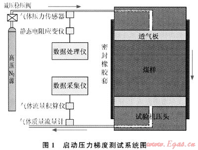 樣品采自陽(yáng)泉煤電集團(tuán)寺家莊煤礦的15#煤層,加工成Φ50×50mm的煤心,實(shí)驗(yàn)系統(tǒng)包括密封橡膠套、試驗(yàn)機(jī)加載及控制系統(tǒng)、高壓氣源、氣體流量及壓力測(cè)試等幾部分(見圖1)。