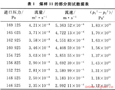 RMT-150B伺服試驗(yàn)機(jī)加載的軸向力4kN,圍壓2MPa,為了保證測(cè)試過程封閉良好,所加氣壓不超過圍壓2MPa。實(shí)驗(yàn)采用“倒退法”:即先將氣壓調(diào)到較高值燃后關(guān)閉穩(wěn)壓閥門,測(cè)試一系列壓力梯度對(duì)應(yīng)的流量。以煤樣11為例,由于出口端直通大氣,因此式(4)中的p2=p0=101325Pa,部分測(cè)試數(shù)據(jù)見表1,計(jì)算的滲透率為0.2mD,流速與壓力平方差的關(guān)系見圖2。