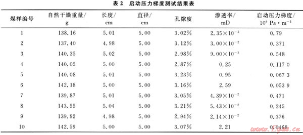 依上述的測(cè)試手段和啟動(dòng)壓力梯度計(jì)算方法,對(duì)同一煤樣鉆取的其余10個(gè)煤心進(jìn)行測(cè)試和計(jì)算,樣品信息和結(jié)果見表2。