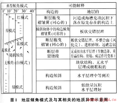 地層傾角測井是一種能直觀反映單井剖面地質(zhì)構(gòu)造的測井方法,通過相關(guān)對比等方法處理得到的傾角矢量圖(圖1),可以了解目的油氣藏砂體的地層產(chǎn)狀特征、砂體展布及古水流和物源方向、判斷地應(yīng)力方向、識別裂縫等[1~7]。