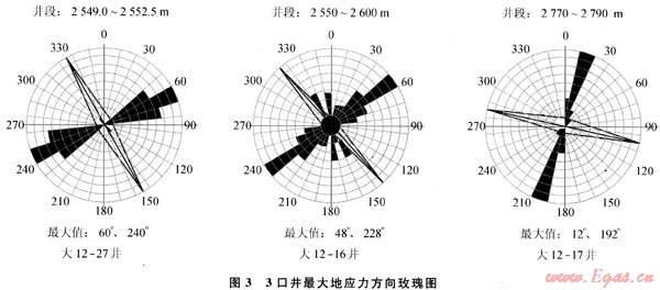 3口井測量井段內(nèi)橢圓井眼現(xiàn)象不太明顯,地應(yīng)力較均衡,在不同時期構(gòu)造形成過程中略有變化,確定的主應(yīng)力方向?yàn)楸睎|-南西向(圖3)。