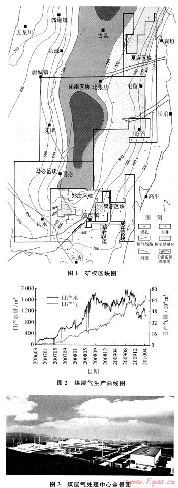 以煤層氣處理中心為標(biāo)志的配套工程建成投產(chǎn)(圖3),從根本上解決了制約煤層氣外輸和利用的瓶頸問題,依托“西氣東輸”干網(wǎng)可以順利實現(xiàn)煤層氣上輸和下載,將為“氣化山西”發(fā)揮積極作用。自2009年9月10日處理中心向“西氣東輸”干網(wǎng)供氣,目前累計完成商品量在1.2×108m3,日外輸氣量在100×104m3以上。