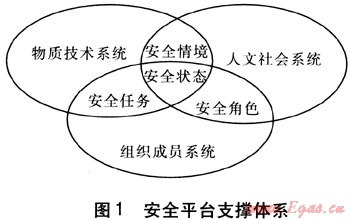 物質(zhì)技術(shù)系統(tǒng)、人文社會系統(tǒng)和組織成員系統(tǒng)3個集合的交叉構(gòu)成了3種聯(lián)系,形成安全情境、安全任務(wù)、安全角色和安全狀態(tài)4個交集。其中物質(zhì)技術(shù)系統(tǒng)與人文社會系統(tǒng)的交集構(gòu)成了管道燃?xì)馄髽I(yè)所處的軟環(huán)境和硬環(huán)境,稱為安全情境。人文社會系統(tǒng)與組織成員系統(tǒng)的交集決定了管道燃?xì)馄髽I(yè)中員工在安全生產(chǎn)中的身份,稱為安全角色。物質(zhì)技術(shù)系統(tǒng)與組織成員系統(tǒng)的交集劃定了組織成員在生產(chǎn)中所擔(dān)負(fù)的責(zé)任,稱為安傘任務(wù)。物質(zhì)技術(shù)系統(tǒng)、人文社會系統(tǒng)和組織成員系統(tǒng)三者的交集成為管道燃?xì)馄髽I(yè)的安全狀態(tài)。安全平臺支撐體系見圖1。
