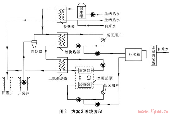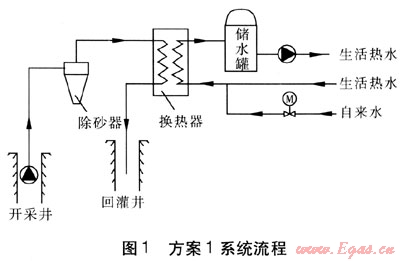 天津市南開區(qū)某住宅小區(qū)擬建兩座高層公寓,規(guī)劃建筑面積約11×104m2。在該小區(qū)內(nèi),現(xiàn)有兩眼奧陶系地?zé)峋?。最初,開發(fā)商只要求利用地?zé)豳Y源解決小區(qū)生活熱水供應(yīng)。設(shè)計(jì)單位考慮到節(jié)能、環(huán)保,為開發(fā)商提供了3種地?zé)豳Y源利用方案,希望地?zé)豳Y源能夠得到充分合理的利用。