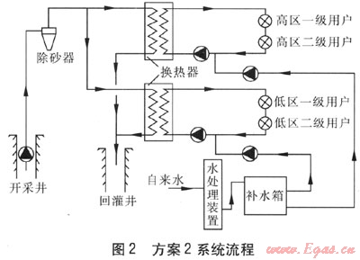 方案2,僅利用地?zé)崴?,生活熱水由電熱水器制備。建筑物分為高區(qū)、低區(qū)供暖系統(tǒng),由于地?zé)峋鏊疁囟葹?0℃,因此宜采用地板輻射供暖系統(tǒng)。為充分利用地?zé)豳Y源,熱用戶采用兩級(jí)串聯(lián)形式,以降低回水溫度,即降低地?zé)嵛菜疁囟?。一?jí)用戶供、回水溫度為50、40℃,二級(jí)用戶供、回水溫度為40、30℃,系統(tǒng)流程見圖2。方案2需在井口附近建1座占地面積為160m2的熱力站,地?zé)崴昧繛?41t/h,回灌溫度為33℃,總用電負(fù)荷為101kW,工程造價(jià)約265×104元。