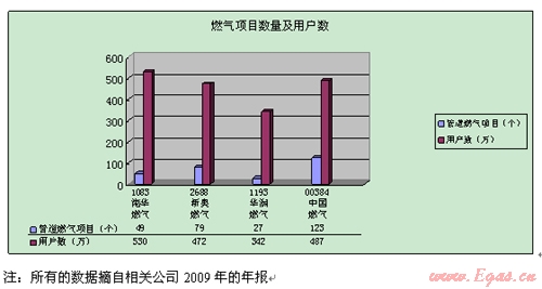 目前在國(guó)內(nèi)的燃?xì)馐袌?chǎng)上,主要有四家大型的燃?xì)饧瘓F(tuán),項(xiàng)目分布在中國(guó)大陸的各個(gè)城市,他們分別是華潤(rùn)燃?xì)猓ü善贝a11933)、新奧燃?xì)猓ü善贝a2688)、中國(guó)燃?xì)?股票代碼00384)和港華燃?xì)猓ü善贝a1083),燃?xì)忭?xiàng)目數(shù)量及用戶數(shù)見(jiàn)下表: