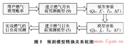 通常,燃氣負荷的月負荷預(yù)測模型比較容易建立。因為,通過統(tǒng)計待預(yù)測地區(qū)的月燃氣費用賬單,就能夠比較方便地建立月負荷預(yù)測模型。相反,由于目前我國城市燃氣負荷計量體系尚不完備,因此燃氣日負荷計量數(shù)據(jù)的收集較為困難,這也給燃氣日負荷的預(yù)測帶來諸多不便。所以我們可以利用上述方法,通過預(yù)測模型(9)來間接地得到燃氣日負荷預(yù)測模型,從而實現(xiàn)燃氣日負荷預(yù)測。其轉(zhuǎn)換關(guān)系如圖5所示。