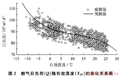 因此,根據(jù)觀測數(shù)據(jù)的分布情況,以有效溫度(Teff)為自變量可建立工作日期間燃氣日負荷預(yù)測模型,如式(3)所示。