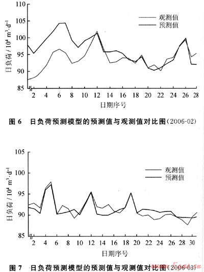 根據(jù)2.1所介紹的方法,分別以2006年2月(最不利工況)和2006年3月(常規(guī)工況)為例,得到燃氣日負荷預(yù)測模型的預(yù)測結(jié)果,如圖6、7所示。