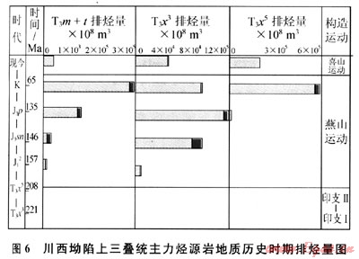 2) 川西坳陷烴源巖J1末期即開始進入排烴門限,J3早期-中期開始進入排烴高峰期。馬鞍塘組-小塘子組烴源巖的排烴高峰期處于J3p-K,T3x3烴源巖排烴高峰期處于J3sn-J3P,T3x5烴源巖排烴高峰期處于K1-K2。