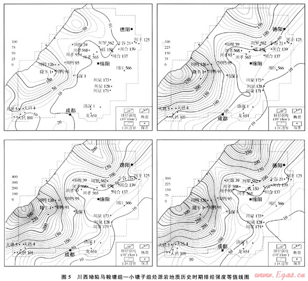 3) 排烴速率指單位體積烴源巖埋深增大100m期間排出烴量,10g/100m,反映地史過程中烴源巖的供烴強度,最大值對應(yīng)著排烴高峰期。從特征圖可以看出,川西坳陷總的烴源巖排烴高峰對應(yīng)為埋深為4250m的時期:馬鞍塘組一小塘子組為4800m的時期;須三段為3600m的時期;須五段為3700m的時期。