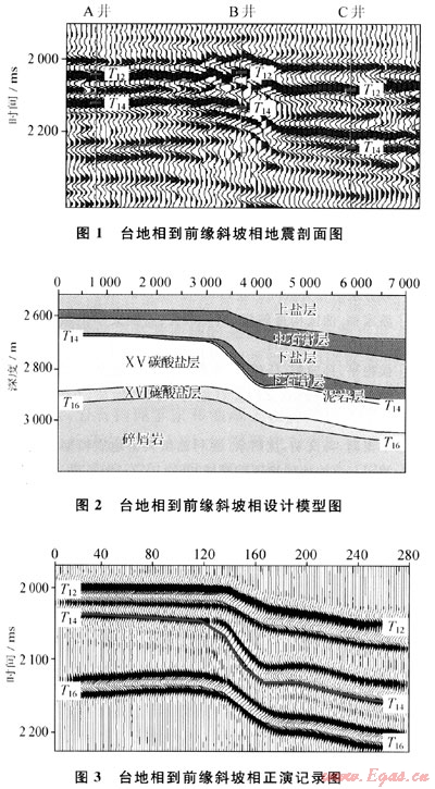 研究區(qū)3口測井資料對碳酸鹽巖頂界(T14)的標(biāo)定結(jié)果見圖1。從圖中可見:臺地相和前緣斜坡相的碳酸鹽巖頂界并不在同一相位上。這對進(jìn)一步的追蹤和解釋帶來了不確定性?;趨^(qū)域地質(zhì)和鉆測井資料分析,設(shè)計了沉積相變區(qū)地震地質(zhì)模型(圖2):臺地相ⅩⅥ碳酸鹽巖層厚度為50~70m,ⅩⅤ碳酸鹽巖層厚度為300~360m,下石膏層厚度為8~15m,下鹽層厚度為70~100m,中石膏層厚度為30~50m;前緣斜坡相ⅩⅥ碳酸鹽巖層厚度為40~60mm,ⅩⅤ碳酸鹽巖層厚度為80~180m,泥巖層厚度為4~38m,下石膏層厚度為20~80m,下鹽層厚度為40~200m,中石膏層厚度為100~140m;中下侏羅統(tǒng)速度為4100m/s,密度為2.40g/cm3;ⅩⅥ碳酸鹽巖層速度為5900m/s,密度為2.75g/cm3;ⅩⅤ碳酸鹽巖層速度為5600m/s,密度為2.65g/cm3;泥巖層速度為4200m/s,密度為2.45g/cm3;下石膏層和中石膏層的速度為6000m/s,密度為2.96g/cm3;下鹽層和上鹽層速度為4500m/s,密度為2.50g/cm3。取Ricker子波作為入射脈沖,依據(jù)實(shí)際地震資料選取的地震波主頻為30Hz。通過波動方程正演計算,得到的理論地震記錄見圖3。