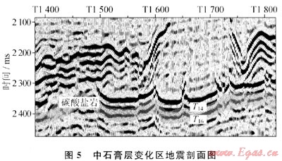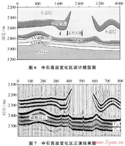 由圖7可見,在中石膏層受擠壓消失或減薄的區(qū)域,碳酸鹽巖頂?shù)捉缑嬖跁r間剖面上出現(xiàn)下拉,形成“眼球”;如果鹽巖中存在石膏夾塊,則引起下覆碳酸鹽巖頂?shù)追瓷渫噍S錯斷,這顯然會使解釋進(jìn)入誤區(qū)。由此可提示,在石膏層變形較強(qiáng)烈的地區(qū),地震解釋要特別關(guān)注中石膏缺失和減薄的區(qū)域。