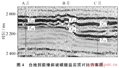 理論記錄與實(shí)際地震剖面的對比表明,從臺地相到前緣斜坡相,碳酸鹽頂界反射(T14)“竄相位”。這證明了井資料標(biāo)定結(jié)果的準(zhǔn)確性。圖中還可以看出,前緣斜坡相碳酸鹽巖反射振幅能量比臺地相的要弱一些,這與實(shí)際地震記錄的情況也是一致的。據(jù)此,落實(shí)了碳酸鹽巖頂界的解釋與對比方案(圖4)。
