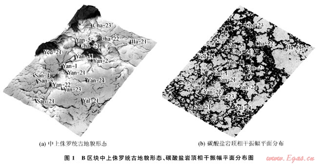 古地貌是控制一個(gè)盆地后期構(gòu)造與沉積特征的主要因素,對(duì)沉積體系內(nèi)的儲(chǔ)層發(fā)育與分布以及油氣藏的富集具有一定的控制作用。通過(guò)古地貌恢復(fù)技術(shù)與三維可視化技術(shù)相結(jié)合,可以從空間角度分析古地貌對(duì)鹽下礁體的控制作用。由于本區(qū)上覆膏巖、鹽巖與碳酸鹽巖速度的差異,極易形成強(qiáng)的巖性界面。另一方面,礁體發(fā)育區(qū)特別是含氣后,速度降低,波阻抗差減小,振幅也會(huì)降低;而礁間帶致密石灰?guī)r儲(chǔ)層,連續(xù)性好、振幅強(qiáng),而因利用振幅屬性能較好的預(yù)測(cè)礁體發(fā)育區(qū)。相干屬性對(duì)地層的不連續(xù)性特別敏感,可以識(shí)別斷裂、裂縫的分布范圍。將古地貌與相干振幅屬性相結(jié)合,可以更好的預(yù)測(cè)礁體的平面分布。圖1-a是研究區(qū)B區(qū)塊楊古伊-恰什古伊氣田碳酸鹽巖沉積時(shí)的古地貌,鉆井證實(shí),生物礁發(fā)育于古地貌較高部位。從圖1-b的相干振幅平面分布圖可以看出,生物礁發(fā)育部位相干性差、振幅為中低振幅,裂縫較為發(fā)育,儲(chǔ)層物性較好,與古地貌隆起區(qū)的分布一致。利用古地貌與相干振幅屬性相結(jié)合,在斜坡相帶已發(fā)現(xiàn)了楊古伊氣田和恰什古伊氣田。鉆井證實(shí),斜坡帶的點(diǎn)礁群是擴(kuò)大B區(qū)塊探明儲(chǔ)量的有利地區(qū)。