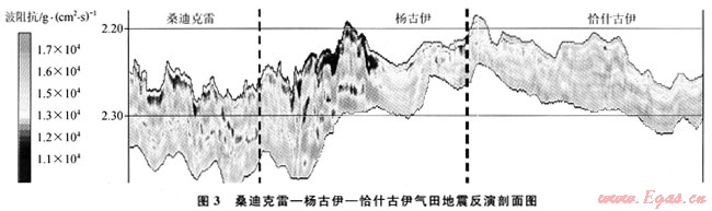 圖3為桑迪克雷-楊古伊-恰什古伊三維區(qū)自南西-北東向分布的反演波阻抗剖面。紅色低阻抗儲(chǔ)層,主要分布在碳酸鹽巖地層的上部,波阻抗值大約在15000g/(cm2·s);藍(lán)色為致密儲(chǔ)層發(fā)育段,具有低聲波時(shí)差、高密度的特征,與前述分析結(jié)果較為吻合。從反演結(jié)果可以看出,西南部桑迪克雷、楊古伊氣田波阻抗值相對(duì)較小,礁體較為發(fā)育,而東北部恰什古伊氣田波阻抗值相對(duì)較大,礁體發(fā)育程度較南部略顯致密。
