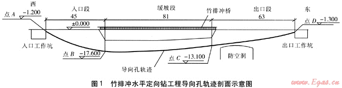 竹排沖水平定向鉆工程導向孔軌跡剖面示意圖見圖1(圖中尺寸單位為m)。