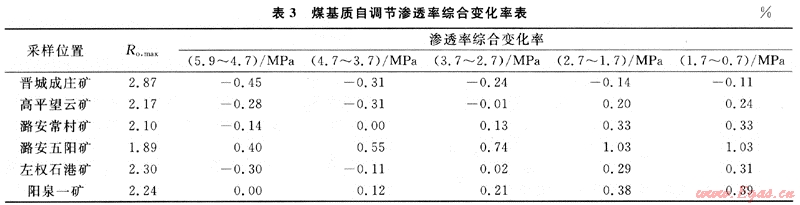 對于給定煤級的樣品,隨流體壓力的逐漸降低,煤基質(zhì)自調(diào)節(jié)滲透率綜合變化率逐漸增大(圖2),也就是有效應(yīng)力滲透率降低率逐漸小于煤基質(zhì)收縮滲透率增加率。這意味著煤層氣開采過程中,隨著儲層壓力逐漸降低,煤儲層滲透率有逐漸增加的趨勢。在較低壓下,煤儲層的滲透率有望得到改善。