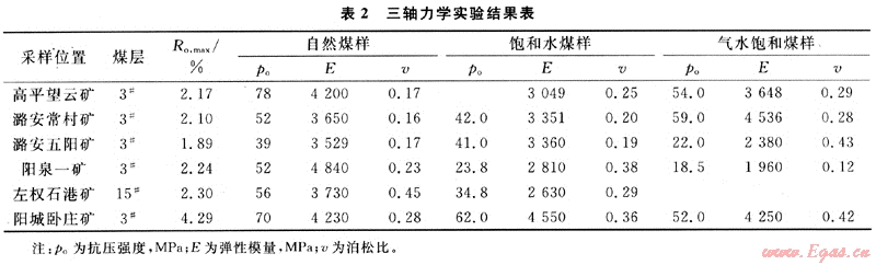 將實(shí)驗(yàn)中得到的軸向應(yīng)變、平均徑向應(yīng)變、軸壓和圍壓代入上兩式,求出每一點(diǎn)的彈性模量和泊松比訓(xùn)。煤樣三軸模擬實(shí)驗(yàn)結(jié)果見表2。