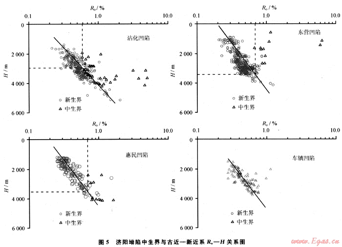 沾化凹陷中生界與新生界有機(jī)質(zhì)成熟度演化曲線相交于2900~3000m,其鏡質(zhì)體反射率在0.6左右。這表明,在新生界沉積前,中生界自身的沉積和較高的地溫梯度[9、21~23]已使烴源巖中有機(jī)質(zhì)的熱演化程度達(dá)到成熟階段。因而,通過新生代沉積進(jìn)而使中生界烴源巖再次活化生烴所需的門限深度大于3000m,Ro>0.6%(圖5)。