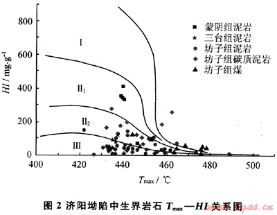 有機(jī)質(zhì)類型是評價(jià)烴源巖質(zhì)量的重要指標(biāo)。從濟(jì)陽坳陷中生界烴源巖Tmax-HI關(guān)系圖可以看出(圖2),巖石樣品主要落在了混合型-腐殖型干酪根范圍內(nèi)。其中坊子組的泥巖、碳質(zhì)泥巖和煤的有機(jī)質(zhì)類型均以偏腐殖混合腐殖型為主,蒙陰組巖石樣品有機(jī)質(zhì)類型相對較好,樣品點(diǎn)主要落在偏腐泥混合-偏腐殖混合型范圍內(nèi),三臺(tái)組主要為腐殖型。