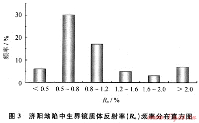有機(jī)質(zhì)成熟度是評價(jià)烴源巖生烴量及資源前景的重要依據(jù)[18~20]。濟(jì)陽坳陷中生界烴源巖鏡質(zhì)體反射率測試表明,中生界烴源巖中91%的樣品其有機(jī)質(zhì)已經(jīng)到達(dá)成熟演化階段,鏡質(zhì)體反射率Ro值在0.5%~1.2%之間,部分樣品的Ro值已高達(dá)2.0%以上,已進(jìn)入過成熟演化階段(圖3)。