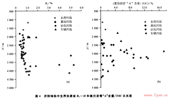 濟(jì)陽坳陷中生界烴源巖有機(jī)質(zhì)的演化程度,無論是平面上還是縱向上都具有很強(qiáng)的不均衡性。從平面上看(圖4),不同地區(qū)有機(jī)質(zhì)熱演化程度差異明顯,沾化凹陷有機(jī)質(zhì)成熟度范圍分布較寬,Ro主要分布在0.45%~1.88%,部分樣品Ro在6.25%~6.55%,已經(jīng)進(jìn)入過成熟階段;車鎮(zhèn)凹陷大王莊地區(qū)成熟度低,Ro在0.62%~0.67%,剛進(jìn)入成熟階段,個(gè)別樣品超過1.0%;東營、惠民凹陷則正處于大量生烴階段。從縱向上看,盡管總的趨勢是Ro在深部位要高于淺部位,但是有機(jī)的熱演化程度并非取決于現(xiàn)今的埋深,同一個(gè)Ro值,對于不同的鉆孔有著不同的埋深;截取同一埋深,對應(yīng)不同的鉆孔也有不同的反射率,并且可溶有機(jī)質(zhì)的轉(zhuǎn)化率氯仿瀝青“A”含量/TOC也是在同一深度具有不同的數(shù)值,而相同的氯仿瀝青“A”含量/TOC在不同深度均有分布(圖4)。