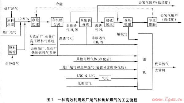 許多城市的煉油廠都與燃?xì)馍a(chǎn)企業(yè)為鄰,甚至雙方已經(jīng)形成了良好的合作關(guān)系,附近有城市燃?xì)夤芫W(wǎng),鋼鐵生產(chǎn)企業(yè)也可能與此距離不遠(yuǎn)。照此看來(lái),如果能將鋼鐵企業(yè)、石化企業(yè)與燃?xì)馄髽I(yè)聯(lián)合起來(lái),在兼顧各方利益的前提下,采用經(jīng)濟(jì)的方式首先提取煉廠尾氣和焦?fàn)t煤氣中的氫氣組分就近利用,之后將其他所有剩余氣體經(jīng)過(guò)簡(jiǎn)單處理后制成符合要求的代天然氣產(chǎn)品供應(yīng)城市燃?xì)夤芫W(wǎng),那么,聯(lián)合體各方就會(huì)各得其所,實(shí)現(xiàn)優(yōu)勢(shì)互補(bǔ),互利互惠。在合作各方獲取效益的基礎(chǔ)上,同時(shí)使能源利用價(jià)值達(dá)到最高化,圓滿解決煉廠尾氣和焦?fàn)t煤氣中各組分物盡其用的問(wèn)題。