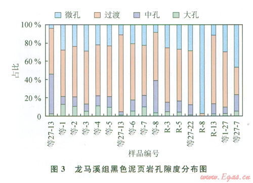 研究結(jié)果發(fā)現(xiàn),下志留統(tǒng)龍馬溪組頁巖樣品中大孔所占比例介于1.1%~12.9%,平均為5.7%;中孔所占比例介于3.5%~43.4%,平均為13.8%;過渡孔所占比例介于30.1%~83.9%,平均為57.68%;微孔所占比例介于3.9%~46.7%,平均為22.82%;空隙以過渡孔為主(圖3),微孔次之,兩種空隙合計所占比例介于61.4%~90.4%,平均為72.79%。