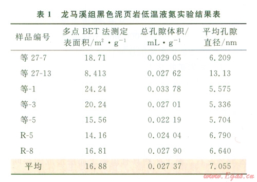 為進(jìn)一步研究四川盆地南部龍馬溪組泥頁巖的孔隙大小分析特征,開展了孔隙大小精確度可達(dá)到0.35nm的低溫液氮實驗。實驗采用的設(shè)備為Autosorb-1型比表面積孔徑測定儀,測試結(jié)果表明(表1);龍馬溪組具有很小的孔隙直徑,平均僅為7.055 nm;低溫液氮吸附等溫線均呈現(xiàn)“板狀環(huán)”,也反映出龍馬溪組孔隙以微孔為主(孔徑小于50 nm)。