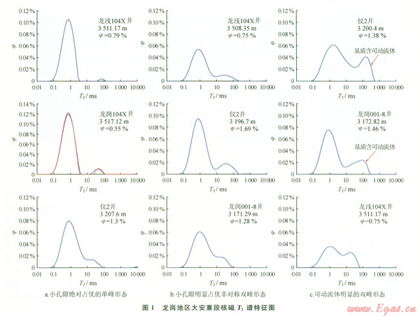 根據(jù)對(duì)中國(guó)石油西南油氣田公司川中油氣礦測(cè)試的秋林1井大安寨段石灰?guī)r壓汞資料的分析,石灰?guī)r基本不具備儲(chǔ)集空間;中國(guó)石油西南油氣田公司勘探開(kāi)發(fā)研究院所作的龍崗地區(qū)大安寨段灰?guī)r的核磁T2譜特征分析結(jié)果,同樣表明其孔隙度極小,而儀2井大安寨段石灰?guī)r孔隙度高,含基質(zhì)可動(dòng)流體,但卻沒(méi)有工業(yè)氣流產(chǎn)出(圖1)。