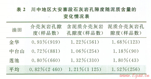 根據(jù)目前已取心鉆井的物性測(cè)試,表明大安寨段主要產(chǎn)層段的石灰?guī)r孔隙度極低,大多小于1%,顯示出非儲(chǔ)集層的特征,油氣產(chǎn)出主要是純石灰?guī)r的裂縫起作用。而有測(cè)試顯示,泥質(zhì)含量越高孔隙度反而越高,石灰?guī)r越純則孔隙度反而越低,純介殼灰?guī)r孔隙度平均小于l%(表2)。