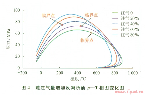 圖4為48.00 MPa下反凝析油與不同比例注入氣混合后p-T相圖變化特征。其中注入氣為采出分離器氣。由結(jié)果圖可見(jiàn),隨著注入氣比例從20%增加到80%,臨界點(diǎn)從右向左偏移,當(dāng)注入氣摩爾含量超過(guò)40%后,整個(gè)體系在地層溫度l