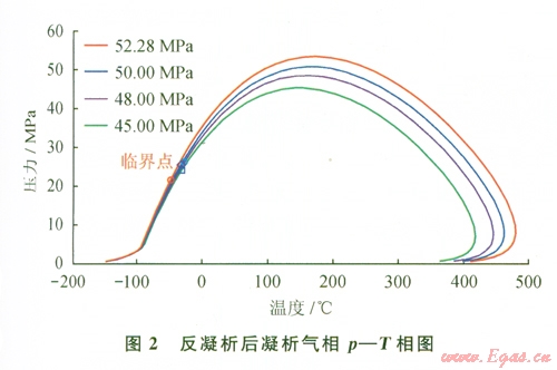 在反凝析組成分析的基礎(chǔ)上,模擬計(jì)算了不同壓力下地層凝析氣相的p-T相圖(圖2)。由圖2可見(jiàn):從52.28 MPa下降到45.OO MPa,隨著壓力的減低,凝析氣露點(diǎn)壓力降低,包絡(luò)線向下縮小。始終處于飽和狀態(tài)。